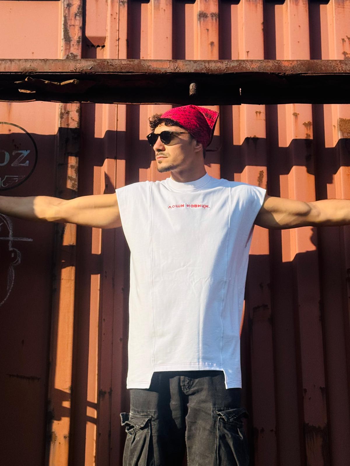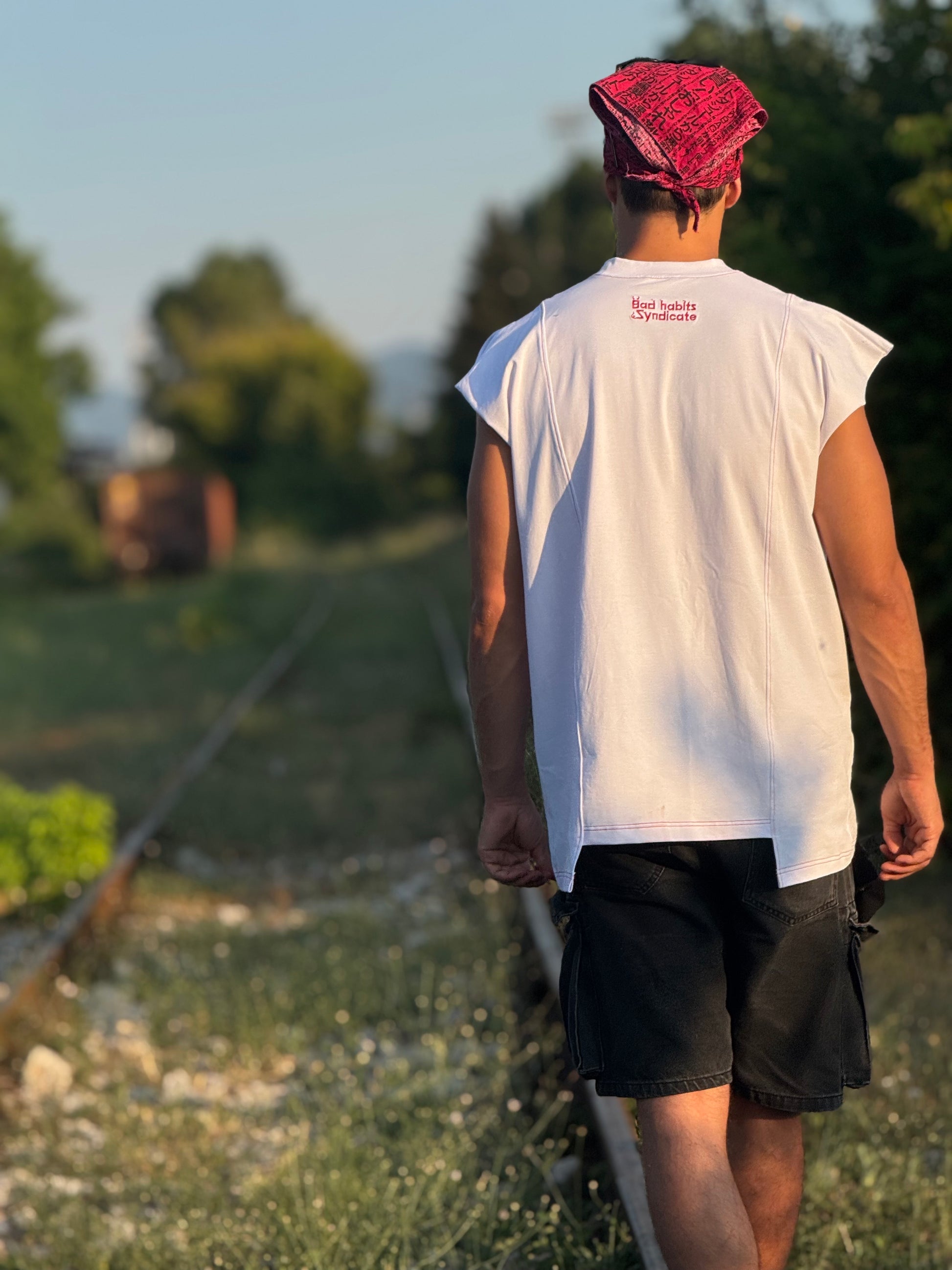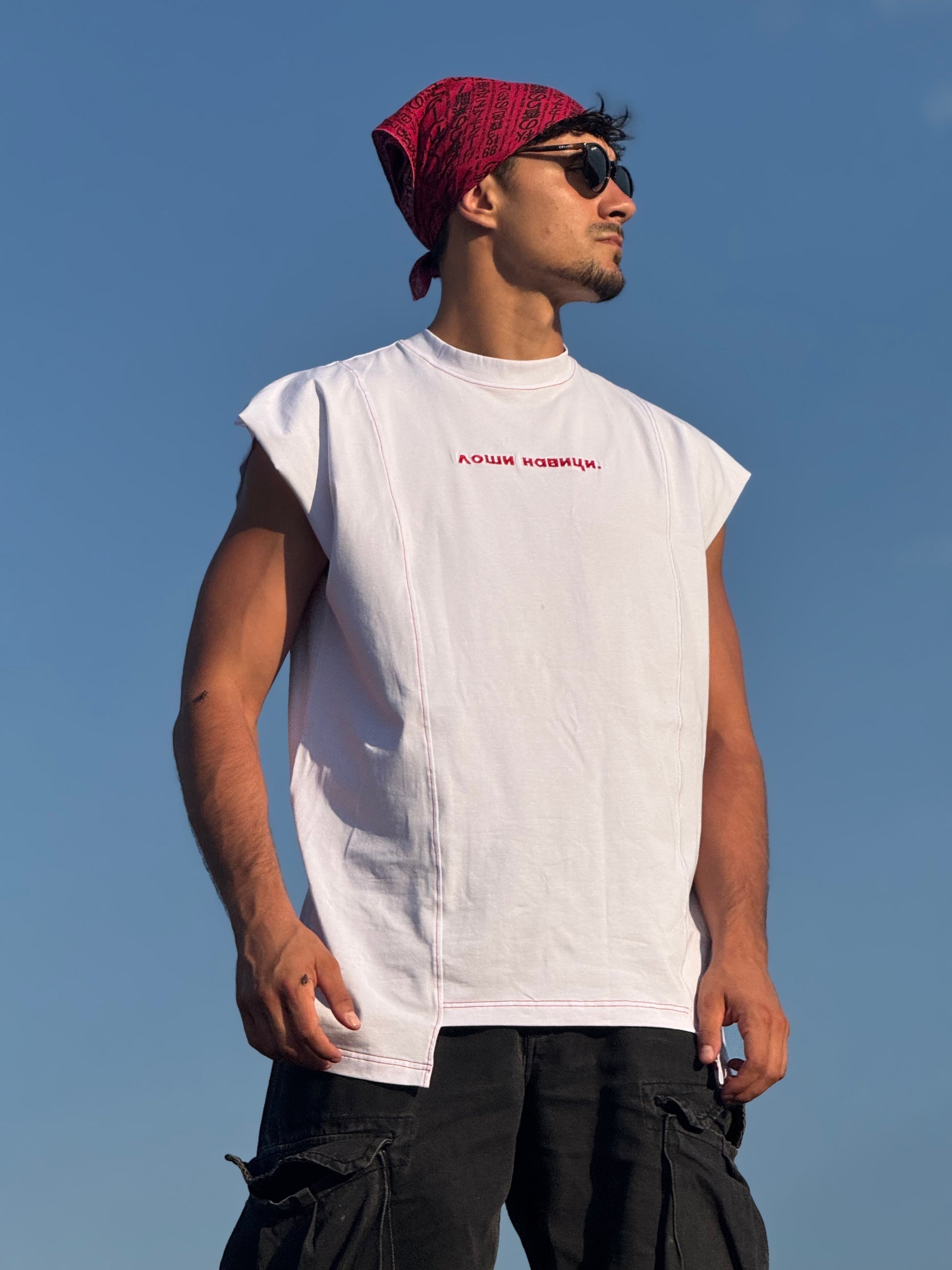 Потник изработен от 100% памук, с бродиран надпис ''лоши навици''. Лесен за комбиниране с всякакъв тип облекло – подходящ, както за през деня, така и за вечерни излизания.