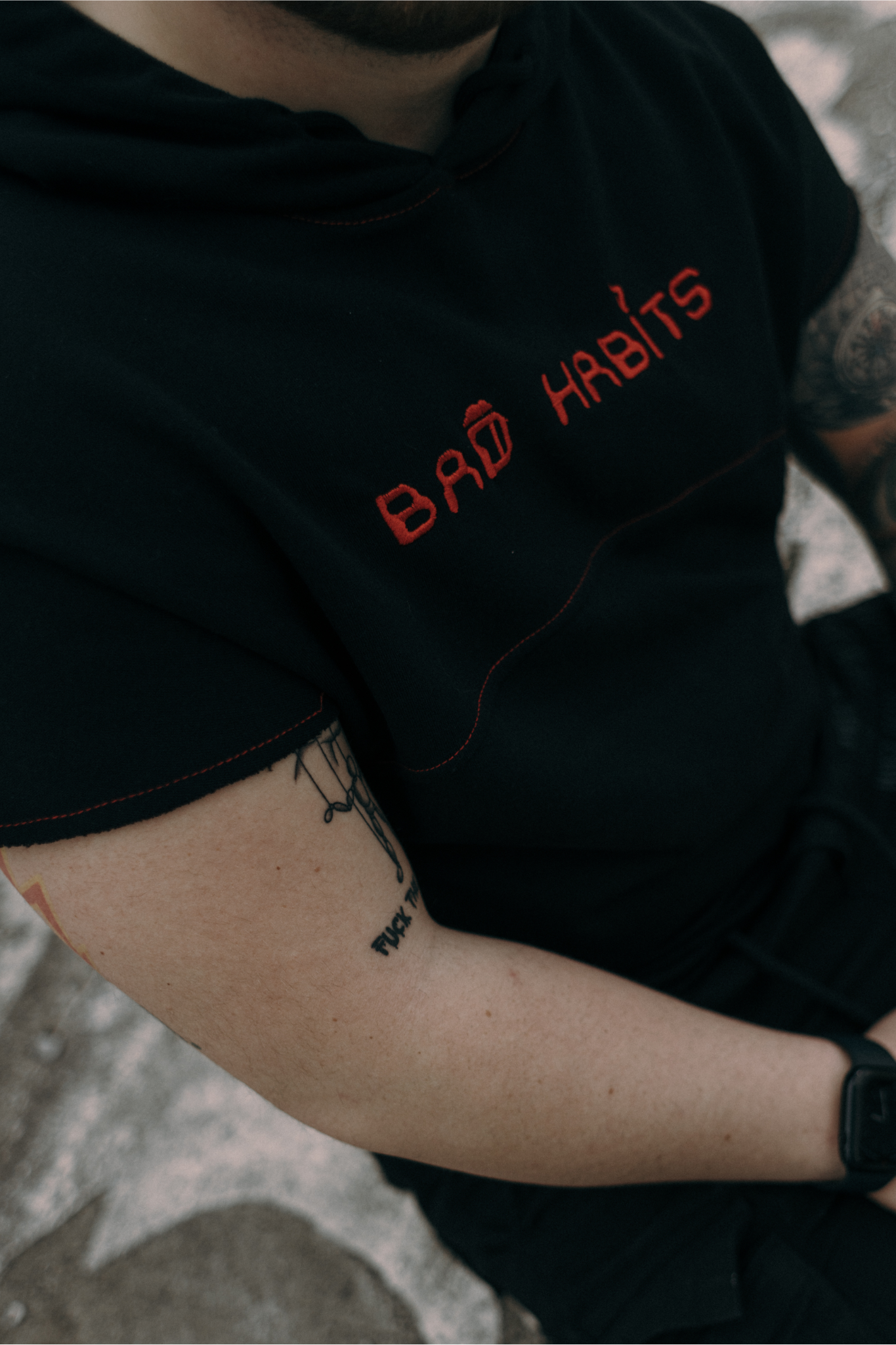 Потник с качулка Bad Habits. Стилен, удобен и лесен за комбиниране. Носи го самостоятелно или върху по-дълги блузи, винаги ще си ТОП